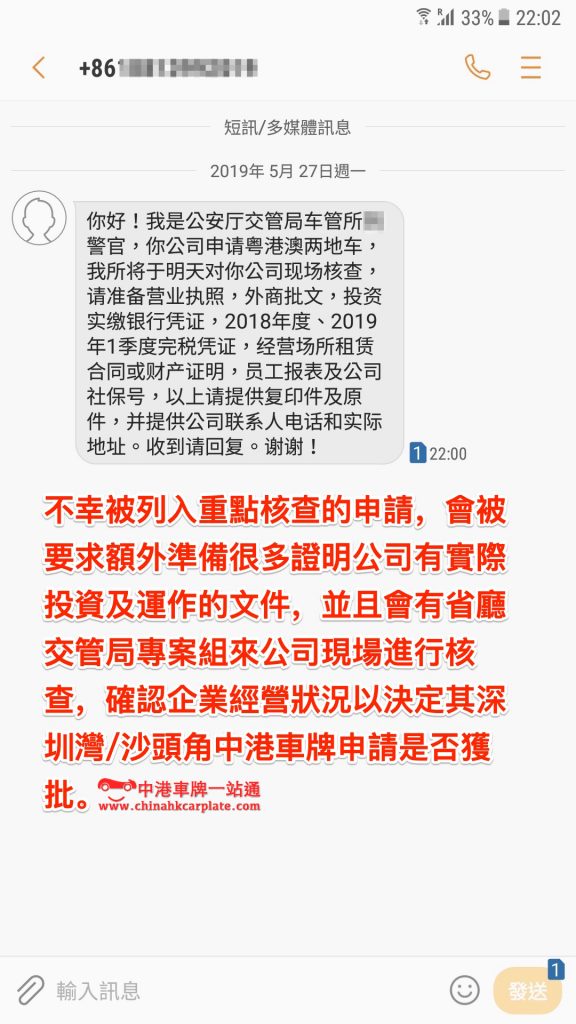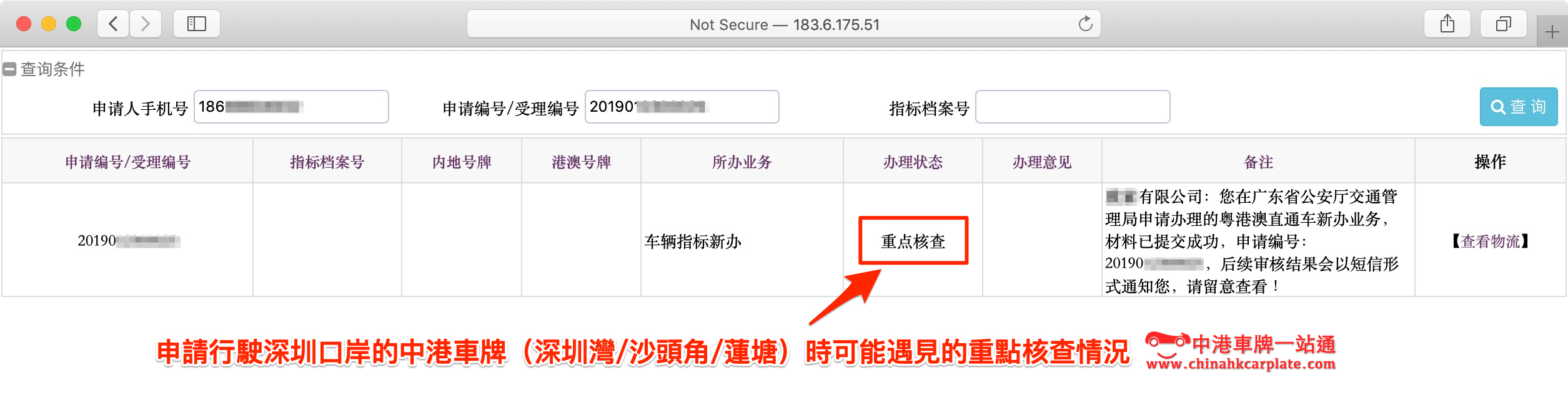 中港車牌的申請被列入重點審查後,廣東省公安廳交通管理局的專案組會在幾個月至一年左右時間安排專人來公司經營場所核查經營狀況,以決定是否批准其中港車牌的申請。原本順利情況下可以在2個月左右取得的牌照,要拖延至近一年甚至更長的時間,申請者面對的是無窮的憂慮同漫長的等待。