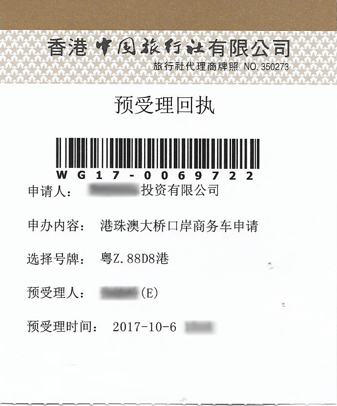 通過港中旅申請港珠澳大橋中港兩地牌,是這次大橋粵港牌申請的一個捷徑。港中旅在這次受理港珠澳大橋牌照申請中,被省廳授予了大部份的審批權利,並且分配了專屬車牌號段供港中旅分配。港中旅成功受理的牌照材料上報至省廳後,省廳多數會採用港中旅審批結果,而只會對相關車輛以及司機的重複性進行核查而確保同一部車或者同一名主司機未在其他中港牌同時出現,核查無誤後港中旅即會在3日左右電話通知申請者前來選號。整個申請手續同簡易程度甚至優勝過直接遞交省廳,所以這次港中旅在代辦港珠澳大橋中港車牌業務中也博得申請者陣陣掌聲!